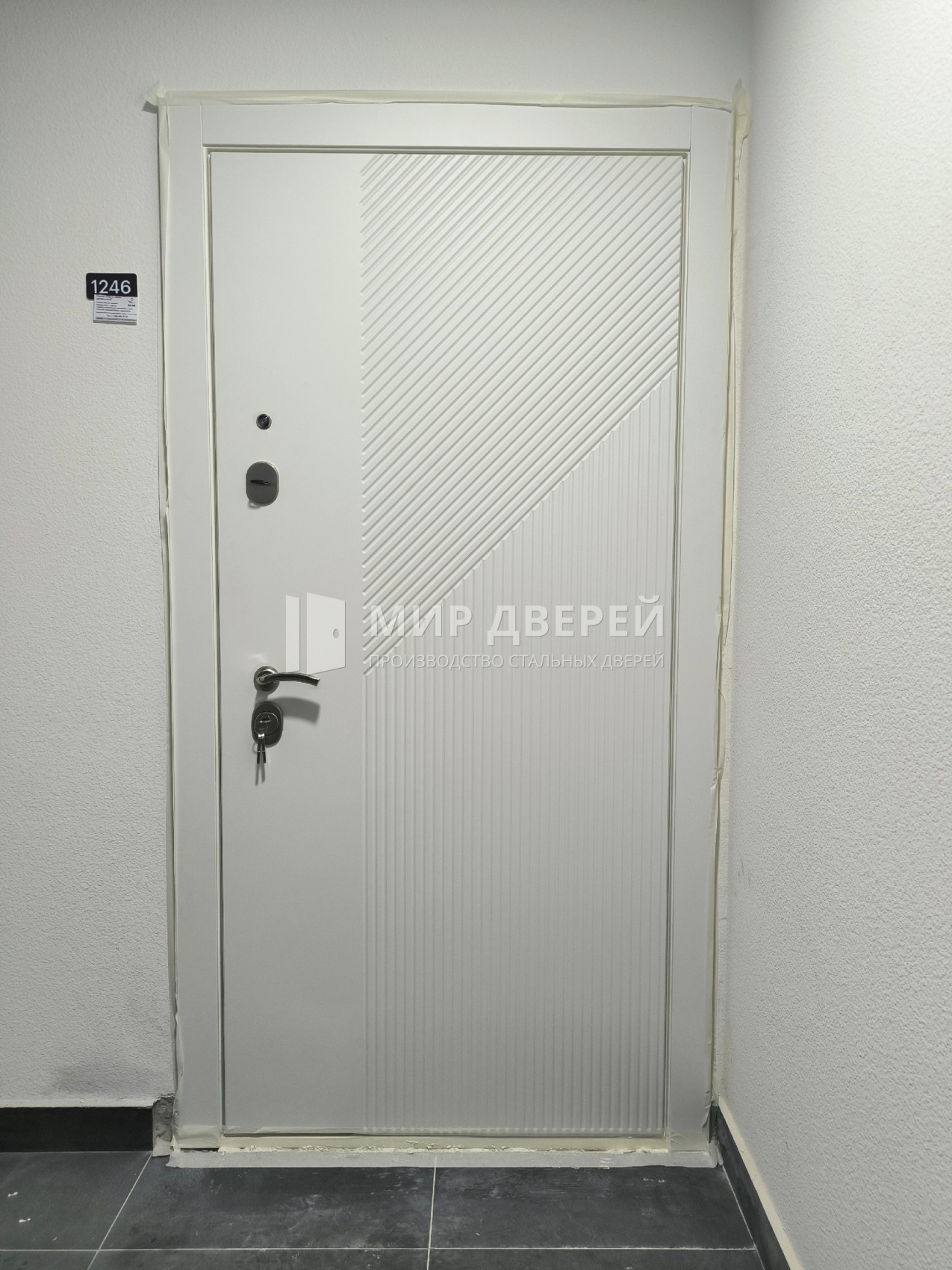 Эта дверь отличается современным дизайном и строгой эстетикой, которая прекрасно подчеркнет интерьер квартиры, офиса или частного дома. Корпус выполнен из профильной трубы 50х25 мм с ребрами жесткости 40х25 мм и стальным листом толщиной 2 мм, что делает конструкцию устойчивой к нагрузкам и надежной в эксплуатации. С обеих сторон поверхность оформлена панелями МДФ ПВХ в темных оттенках серого и черного, создающих стильный и солидный внешний вид. Входная дверь для квартиры №1 гармонично впишется как в классические, так и в современные интерьеры, сочетая визуальную привлекательность с функциональностью. Два контура резинового уплотнителя обеспечивают хорошую изоляцию от шума и запахов, при этом при необходимости конструкция может быть дополнительно оснащена плитой минваты или пенопластом для повышения тепло- и звукоизоляции. Блокираторы усиливают защиту, а универсальность модели позволяет изготавливать изделие в любых размерах и дополнять его различными элементами — от декоративных вставок до установки видеодомофона, что делает дверь не только надежной, но и максимально удобной в эксплуатации.